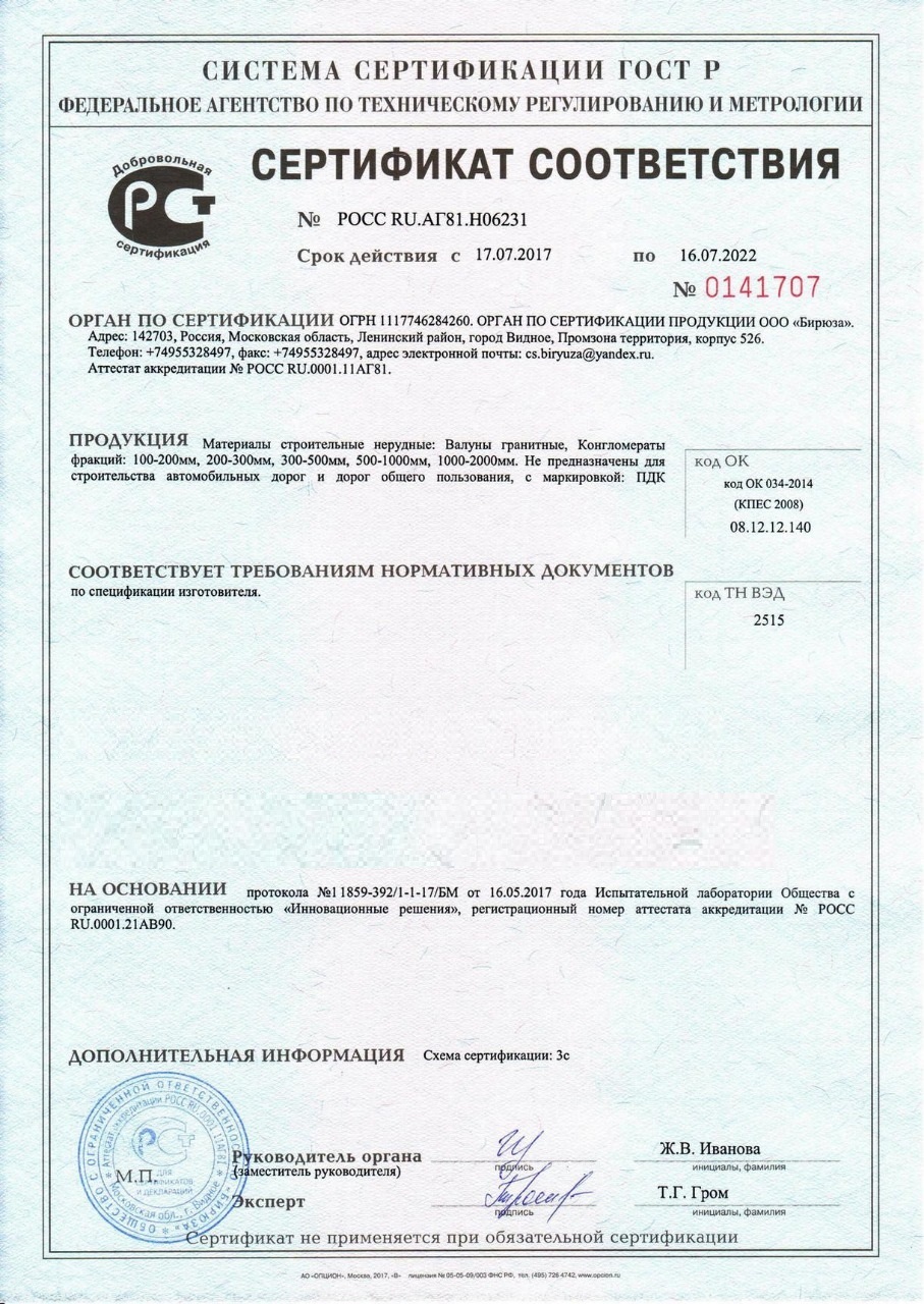 Сертификат соответствия – документ, подтверждающий соответствие продукции требованиям качества и безопасности, установленными для нее действующими стандартами и правилами. Наш камень, который Вы сможете заказать с доставкой в Йошкар-Оле , обладает всеми необходимыми документами для реализации и при необходимости могут быть предоставлены все необходимые подтверждающие документы при поставке.